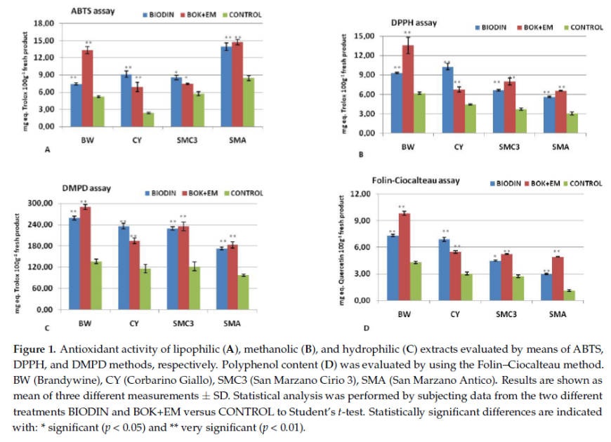 The below graphs show the Anitoxidant data. This showed that among all varieties, Brandywine and San Marzano Antico treated with EM revealed an increase of antioxidant capacity in the three fractions (lipophilic