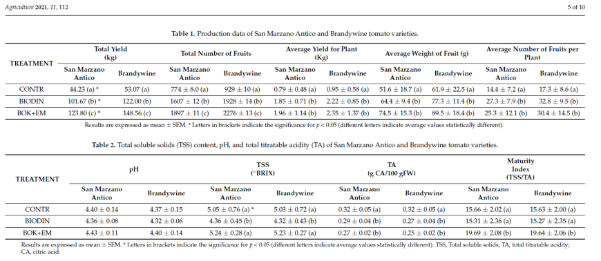 This study, published in the Agriculture Journal on the science and technology of crop and animal production, looked at the Productivity and Nutritional Trait Improvements of Different Tomatoes Cultivated with EM and Biodynamic preparations. It showed an increase of plant productivity as well as an enhanced antioxidant activity in varieties treated with EM technology. Moreover, the polyphenol and carotenoid contents also changed, in response to the plant treatments.