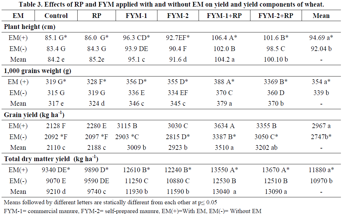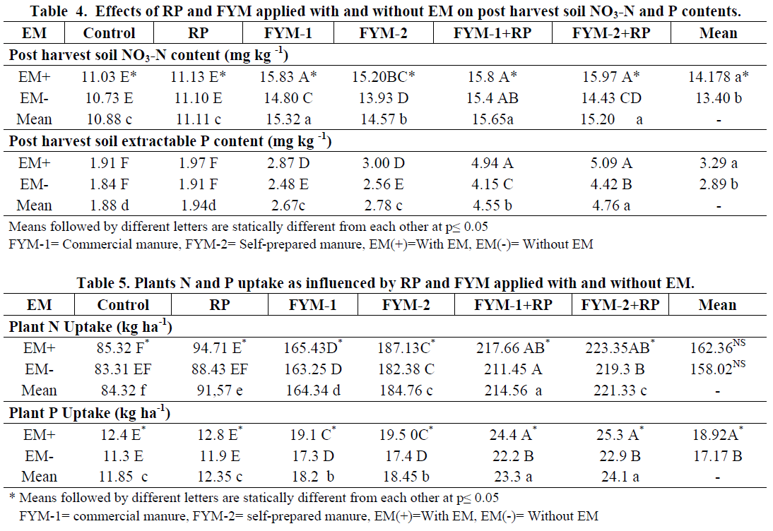 The results (Table 5) showed comparatively higher plant N and P uptakes with the application of EM. Data regarding Plants P uptake by wheat plants revealed significant (p≤0.05) increases by all of the applications including EM. The interaction of EM levels (main-plot) and RP and FYM combinations (sub plot) also showed significant (p≤0.05) effect on plant P uptake of wheat.