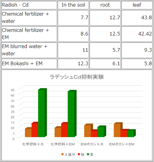 In the pot cultivation of Komatsuna and Radish, we made the soil with EM Bokashi and chemical fertilizer, and mixed Cd. In addition, the irrigation method was also classified into two types, EM and water, and the measured values of heavy metals in crops were compared in soil, respectively.