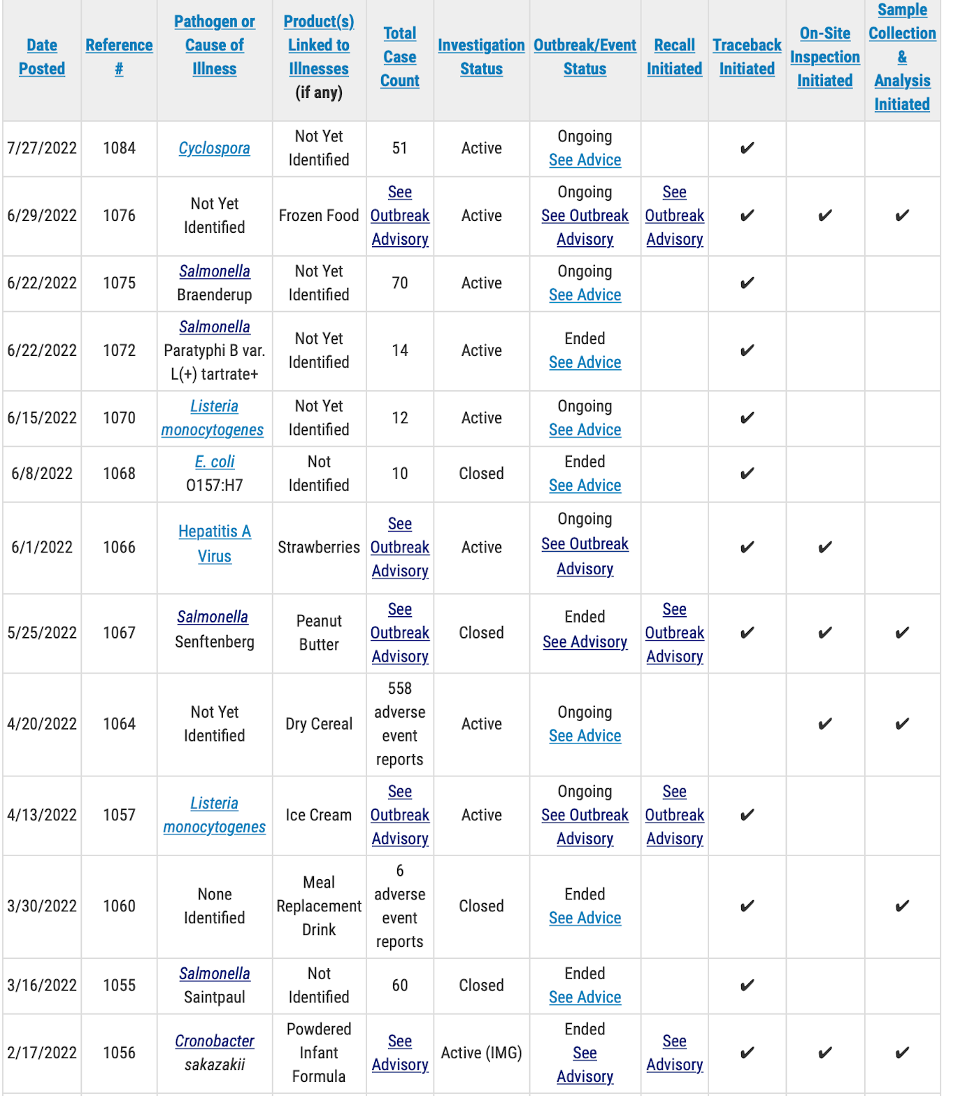 A public health advisory will be issued for investigations that have resulted in specific, actionable steps for consumers to take to protect themselves, according to the FDA. Please direct your attention to those pages for the most up-to-date information on the investigation and for consumer protection information.