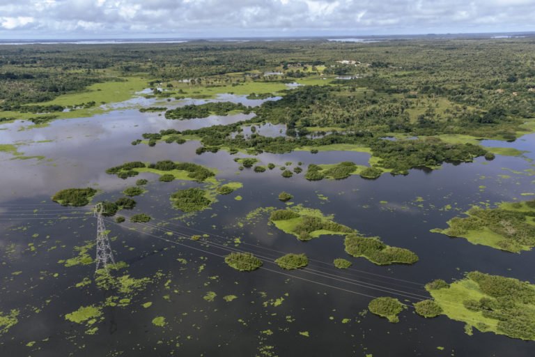 The village of Frades, in Anajatuba, is home to an unusual site: flooded fields advance over the backyards of the houses where there are also large cisterns to capture rainwater. “That’s our life. Lots of water for six months and then drought in the other half of the year,” says family farmer Cleude Maria dos Santos. “That’s why we store rainwater, but the fields provide food all year round. Now everything has changed with these transmission towers inside the fields, especially the fish, which used to be abundant and now are scarce.”