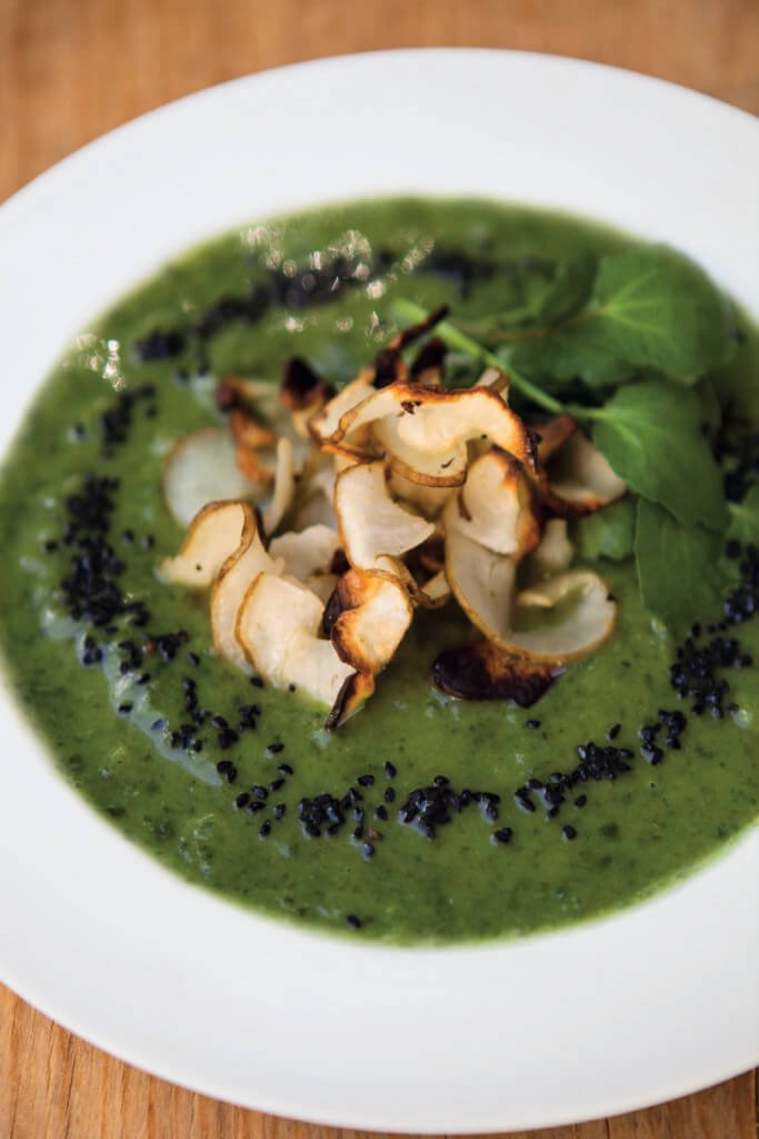 “This is a beautiful, vibrant green spring soup that comes together quickly and is simple to prepare. Wild watercress has a refreshing, clean and peppery flavor that is balanced out by the deeply savory umami taste of kelp, while cauliflower lends its silky texture to this mineral‑rich spring‑ time soup. Prepare the fermented Jerusalem artichokes at least three days in advance.�?—Laura Jany, wild food forager, Kelowna, BC