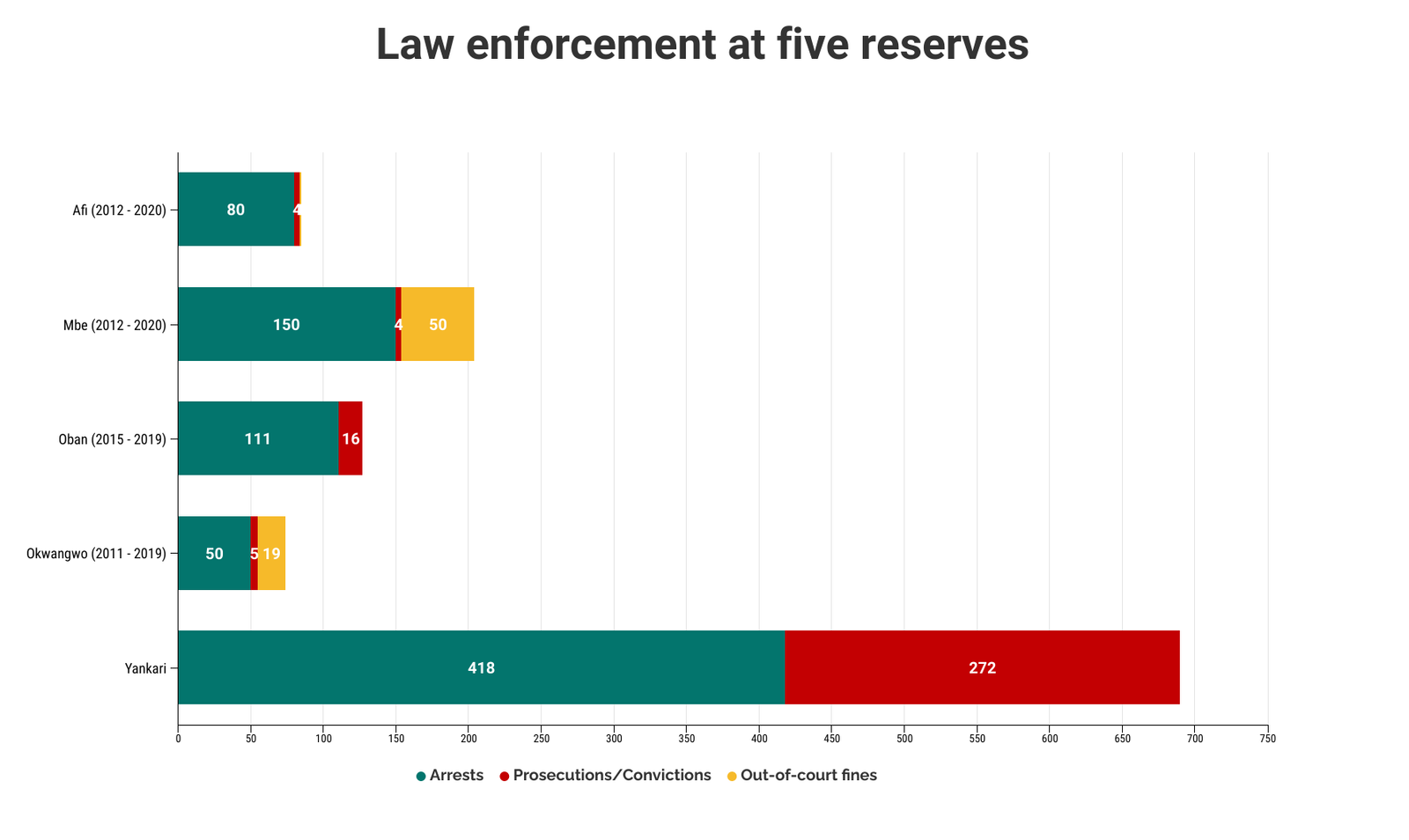 Law enforcement records reviewed by Premium Times and Mongabay covering four protected areas in Cross River state — Afi, Mbe, Oban and Okwangwo — and Yankari National Park in Bauchi state, show a similar pattern of low prosecution rates.