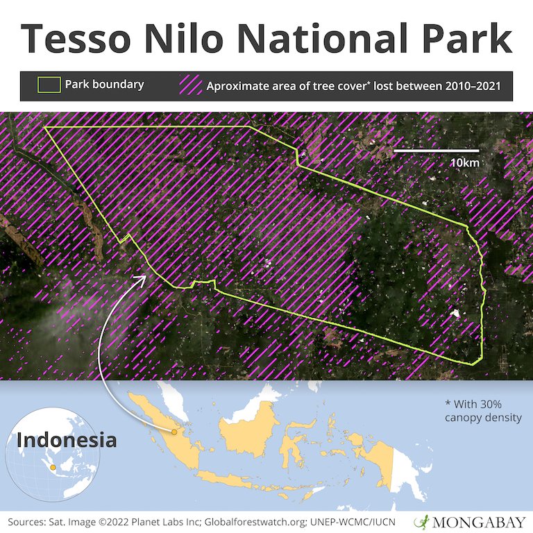 But the capacity of Tesso Nilo to support its wildlife is under threat, with data from the University of Maryland (UMD) visualized on the platform Global Forest Watch showing deforestation nearly tripled between 2020 and 2021. Satellite imagery from Planet Labs suggests this trend may be accelerating, with large swaths of the park’s remaining primary forest cleared in 2022.