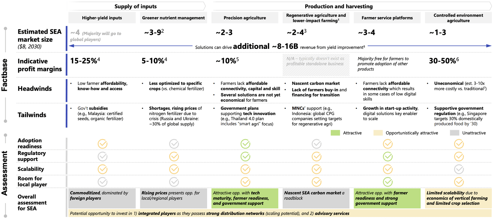 - The report pinpoints precision agriculture and farmer marketplace platforms as the most attractive investment opportunities in ag because they enjoy “strong regulatory support, especially in Malaysia, Thailand, and Vietnam.”
